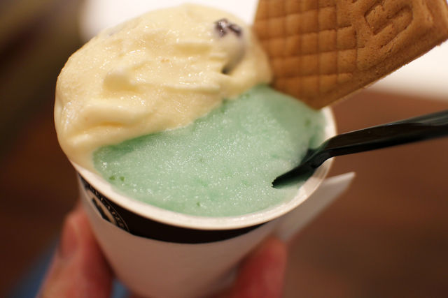 そして、シャクシャクシャーベットなアップルミントと、ねっとりジェラートなラムレーズンは、延々と往復してもずーっと舌を楽しくさせてくれる。